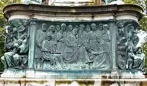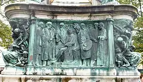 The frieze on the east face of the monument depicts thirteen prominent Victorians from the fields of arts and culture. They are, from left to right: