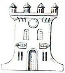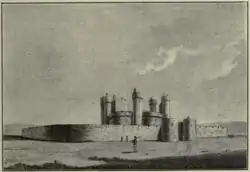 The circular rotunda enclosed a central paved courtyard with a "great well" in the middle. The exterior wall of the rotunda had six circular towers regularly spaced, apart from the two which protected the main, eastern entrance.[12] The Commissioners reported that the rotunda contained twelve rooms "downstairs" and "about forty rooms from the first story upwards".[14] About 30 yards (27 metres) out from the rotunda was a plain circular curtain wall enclosing a bailey our outer court. The curtain had only two towers which formed a gatehouse for the main entrance at the western side, meaning that any attackers who forced this gate would have had to make their way around to the other side of the bailey to find the rotunda entrance. The curtain wall was surrounded by a large circular moat.[12] Opposite the rotunda entrance was a postern, a small secondary gate for pedestrians. The postern and the main gate were linked to the rotunda by walled passages which divided the bailey. It is known from the castle records that two stone buildings were built in the bailey from 1369 to 1377, although their form and function are unknown.[5] Records also suggest that the castle had a fish pond and a garden.[12] The whole building was estimated by the Commissioners to "upwards of three acres of land".[14]