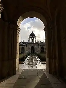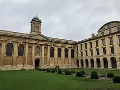 The main entrance on the High Street leads to the front quad, which was built between 1709 and 1759. There are symmetrical ranges on the east and west sides, while at the back of the quad is a building containing the chapel and the hall.[7] The architect Nicholas Hawksmoor, a leading figure of the English Baroque style, provided a number of designs that were not used directly but that heavily influenced the final design. In the cupola above the college entrance is a statue of the British queen Caroline of Ansbach by the sculptor Henry Cheere; the legend 'Carolina Regina, Nov. 12, 1733' may be found marking the laying of the foundation stone of the screen wall, which is visible from the High Street.[7]