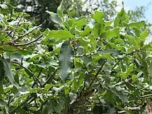 It is a deciduous tree growing up to 15 metres (49 feet) tall with gray bark. The leaves are thick and leathery, up to 12 centimetres (4+3⁄4 inches) long, oblong or lance-shaped with no teeth or lobes.[3][5][6]
