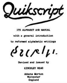Quikscript (also known as the Read Alphabet[1] and Second Shaw) is an alphabet which is intended as a replacement for traditional English orthography with the Latin alphabet. It is a compact phonemic orthography, designed to be comfortably and quickly written. Quikscript has been adapted for other languages, using the same letters for phonemes absent in English phonology.