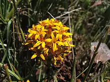 Quinchamalium chilense is a herbaceous, hemiparasitic, perennial plant with a rhizome, from which smaller rootlets with haustoria grow. From the rhizome a number of rarely-branching stems grow each year. These can be decumbent (creeping over the ground) or rise to over 2 metres in height. The flowers are produced in a cluster at the end of the stems, they are pentamerous and usually orangey-yellow in colour. It is extremely variable in height and flower size and colour, so much so that at one time 21 species were recognised, but in 2015 these were all reduced to synonymy with Q. chilense.[5][3] It is heterostylous;[5] some individuals bear 'thrum flowers', flowers which have short styles. This is somewhat correlated with elevation and cold. The leaves are also variable among individuals, they can be narrow or broader, the plants with more narrow leaves correlated with higher temperatures. The size of the plant appears correlated with annual precipitation.[4]