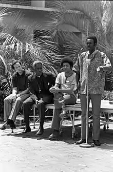 Rally in defense of the Quincy Five. Seated (L–R): ?, Father David Brooks, Charles Steele – son of Rev. C. K. Steele and organizer of the Defense of the Quincy Five
