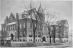 The first school dedicated to high school in Quincy, Illinois began construction in 1891 at the corner of 12th and Maine. The building was designed by local architect, Harvey Chatten, designer of the city hall at 3rd and Hampshire, and the Newcomb Mansion. The dedication ceremony was held on June 17, 1892.[8] An addition was completed in 1905-1906.[9] This "Pride of the Gem City" served students as Quincy's population continued to grow and secondary school enrollment increased dramatically. Superintendent Charles M. Gill first proposed building a new state of the art high school in the Quincy Daily Whig on New Years Eve, 1916, announcing: "It is time to plan for it a new home that will foster a love for the school... for a better preparation to be better neighbors, better citizens, more successful and happier workers, better leaders, and better followers."