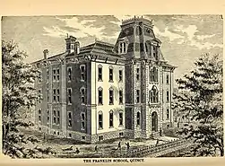 Quincy High School was first established in September 1864 in the old Unitarian Church building at Sixth and Jersey streets, in what was then known as the Center School building. In 1866, the High School was transferred to the Jackson School building at 8th and Vine (now College) Street. From there it was transferred to the top floor of the Franklin School on 5th Street between York and Kentucky, where it remained until plans were made for a dedicated high school.[6] The Franklin School was destroyed by a fire in February of 1905.[7]
