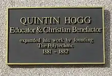 Quintin Hogg (14 February 1845 – 17 January 1903) was an English philanthropist, remembered primarily as a benefactor of the Royal Polytechnic institution at Regent Street, London, now the University of Westminster.