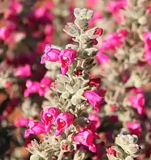 The flowers are arranged in the upper leaf axils, usually in a groups of between five and nine flowers, each on a woolly pedicel mostly 3–10 mm (0.1–0.4 in) long. There are bracts and smaller bracteoles which are woolly on the outside, at the base of the flowers. The five yellow sepals are 10–13 mm (0.4–0.5 in) long and joined at the base to form a tube 1–2 mm (0.04–0.08 in) long, with thin, lance-shaped lobes on the end. The sepal tube is densely covered with woolly hairs on the outside and more or less glabrous on the inside. The petals are pinkish-white with pink spots inside the petal tube. The five petals are 12–18 mm (0.5–0.7 in) long, forming a tube 6–8 mm (0.2–0.3 in) long with a wide opening and five lobes. The two upper lobes are short and oblong, the two lower outer lobes are small and triangular and the middle lobe is more than twice as large as the other four. The outside of the petal tube is covered with short, soft hairs and is glabrous inside apart from a ring of hairs around the ovary. The four stamens are about as long as the petal tube, the upper pair much shorter than the lower pair. Flowering occurs mainly from July to December and is followed by fruit which is a curved oval shape, 2.5–3 mm (0.098–0.12 in) long, covered with soft hairs and has the sepals attached.[3][4][5]