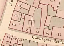 The site was formerly made up of three smaller properties. The corner property was listed in Copenhagen's first cadastre of 1689 as No. 71 in Snaren's Quarter, owned by merchant Christian Meyer. The adjacent property in Rådhusstræde was listed as No. 144, owned by tailor Frederik Knøtel. The next property in Rådhusstræde was listed as No. 145, owned by hatter Claus Scharmer. No. 144 and No. 145 were later merged into a single property. It was listed in the new cadastre of 1756 as No. 127 in Snaren's Quarter and belonged to hatter Niels Eegholm at that time. The old No. 71 was listed as No. 128 and belonged to baker Hans Reimer.[1]