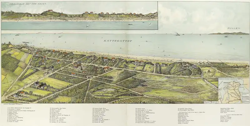 The first tourists began to arrive at the turn of the 20th century. In the early 1910s, Anders Nielsen, the owner of Damgården, sold most of his land off in lots to wealthy people from the city. Anders Nielsen's Son, Niels Nielsen, made a business out of picking the new residents and their belongings up in Helsinge at the beginning of the summer season and to drive them back at the end of the season.[6] Anders Nielsens was Vej was after Anders Nielsen's death named after him and the new landowners in 1921 erected a memorial stone at the end of the road to commemorate him.