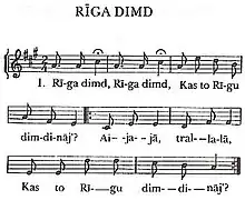 Rīga dimd (English: Riga resounds) is the title of a traditional Latvian folk song that is best known as a musical composition by Jānis Cimze. Cimze's first composition of the song is from 1872, and the composition was performed 1873 at the I All-Latvian Singing Festival by a male choir.[1] The tower bell music of the Saint Peter's Church in Riga, Latvia, plays Rīga dimd five times a day.