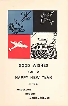 Madeleine and Robert Perrier, by virtue of their diverse connections in haute couture, were both respected socialites. Large social gatherings at their home occurred regularly, bringing together eminent artists and designers who would share and discuss their latest works. Early on, painter Sonia Delaunay, a close colleague of Robert Perrier, was most active in introducing new artists to the gatherings, aided by her husband, Robert, and son, Charles. The Perrier family's informal soirées, increasingly influential as time progressed, were at last formally baptized in the first hours of the year 1930, when New Year's Eve guests officially founded the artistic salon of R-26 ('R' for Robert Perrier and '26' for 26 Rue Norvins).[3] Among these founding members was painter Georges Vantongerloo, who that night designed the salon's iconic Cubist shield.[4]
