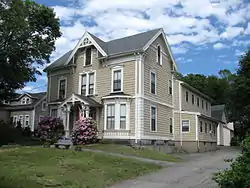 The R.P. Turnbull House is a historic house at 6 Pine Street in Stoneham, Massachusetts. The ornately decorated Italianate house was built c. 1865 for R. P. Turnbull, a partner in the Tidd Tannery. The main block of the house follows a typical Italianate three bay plan with a large central cross gable section on the roof. The central entry is sheltered by an elaborately decorated porch, and the flanking bay windows are topped by roof sections with decorative brackets. The main cornice is studded with paired brackets, and the gable ends have decorative shingle work around round-arch windows, with some Stick style decorative woodwork at the point of the gable.[2]