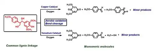 Lignocellulose disassembly to break down common lignin linkage into monomeric molecules by transition metal-based catalysts.