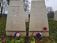 The Wellington crashed outside the sergeants' mess, killing five of its six crew.[5] They are buried in a single shared grave at Pinner New Cemetery,[6] 4 miles (6.4 km) from Bentley Priory.