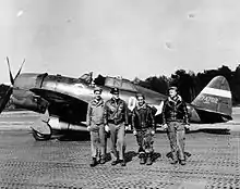 Sergeant Elwin D. Phillips, Lieutenant Sidney Hewitt, Staff Sergeant Michael Yahawk and a colleague, of the 361st Fighter Squadron, 356th Fighter Group stand with Hewitt's P-47 Thunderbolt (QI-F, serial number 42-74702) nicknamed "Clarkie" at Goxhill, 1943.