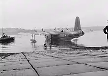Initially, the seaplane service only operated and carried out maintenance from a specially adapted floating dock known as HMS Flat Iron. This floating dock was able to submerge and allow two seaplanes to navigate onto it and then raise itself back up to allow for complex maintenance.[10] During the 1930s the Royal Air Force improved RAF Pembroke Dock by the installation of two 'B' and one 'T' hangar and in 1938, the floating dock was towed to Invergordon as it was redundant.[10] In 1935, the first spillway was constructed which allowed aircraft to be removed from the water whatever the tide.[11] During this period, Sir Arthur Travers Harris (Bomber Harris) was the Officer Commanding of RAF Pembroke Dock and No. 210 Sqn, as a Wing Commander.[12]
