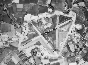 RAF Sudbury was opened in 1944 and was built as a standard Class A heavy bomber airfield, with three intersecting concrete runways of standard lengths, fifty hardstands and two T2 hangars, to meet the USAAF bomber requirements. The airfield had a slight gradient towards the north-east and was constructed on what had been farmland. Most of the temporary building accommodation for some 3,000 men was situated around the village street of Great Waldingfield to the east of the airfield and was accessible by crossing the B1115 road from Sudbury to Lavenham. The facility was used by the United States Army Air Forces Eighth Air Force. Sudbury was given USAAF designation Station 174[1] (SU).[2]