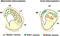 Neuronal development: mammals (left) and avians (right) have different patterns of reelin expression (pink). Nomura T. et al., 2008.[56]