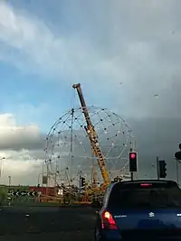 The RISE sculpture was designed by Wolfgang Buttress and consists of a geodesic sphere suspended inside a larger, 30 m (98 ft) diameter sphere, standing at an overall height of 37.5 m (123 ft).[5] Geodesic refers to the shortest path between two points on a curve so that in the case of the RISE sculpture, adjacent connections on each of the spheres are connected using straight bars, thereby minimising the distance between two points.[5] At 30m wide and 37.5m tall, RISE is the biggest public art sculpture in Belfast.[6]