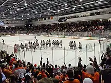 The Tigers moved into the 4,300-seat Gene Polisseni Center for the 2014–15 season.[17] Their first season in the Polisseni Center saw the Tigers finish with a 20–15–5 overall record. They played in the Mariucci classic, losing both games against number-9-ranked Massachusetts–Lowell and number-8-ranked Minnesota. In the playoffs, they swept the Air Force Falcons in the second round after receiving a bye in the first round. The Tigers went on to defeat Canisius in the semifinals of the AHA Tournament by a score of 2–1 and the Meryhurst Lakers in the championship game by a score of 5–1 to win the Atlantic Hockey championship and advance to the NCAA Division I tournament for the second time in program history. The Tigers knocked off the Minnesota State Mavericks in the first round of the NCAA tournament 2–1, becoming the first #16 seed to defeat the top overall seed since the 16-team format was implemented in 2003.[18] There would be no repeat, however, of the 2009–2010 run to the Frozen Four as the Tigers fell to the University of Nebraska Omaha Mavericks in the following round by a score of 4–0, ending their playoff run.[19] In the 2015–16 season, the Tigers lost home ice in the first round to Mercyhurst as they were swept in their last two games of the regular season on home ice; however, the Tigers returned the favor in the postseason by sweeping the Lakers on the road. The Tigers once again were in the AHA tournament and faced the Air Force Falcons once again. The Tigers trailed 1–0 heading into the third and it would appear that they were headed to another shutout loss, but Andrew Miller scored with under 3 minutes left in the third to even the score. In overtime, the Tigers completed their comeback winning 2–1. The Tigers would then claim the Atlantic Hockey championship once again, convincingly defeating the Robert Morris Colonials by a score of 7–4, to advance to the NCAA Division 1 tournament for the second consecutive season.[20] The team's playoff run ended in the first round of the east regional in Albany, New York by the first-ranked Quinnipiac Bobcats by a score of 4–0.[21] The 2016–2017 season was a down year for the Tigers as they flirted with the .500 mark within their conference and were unable to defeat any non-conference teams. They faced Niagara in the first round of the playoffs losing a close one 5–4 in game 1 but shutting them out 5–0 in game 2 setting the stage for the deciding game 3. They were unable to complete the comeback as the Purple Eagles ended the Tigers' season winning 4–1.