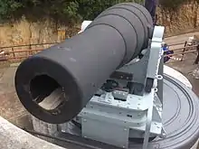 ![]() Restored Mark I, RML 9-inch 12-ton gun being fired at Simon's Town in 2014, with replica ammunition in the foreground | |