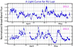 - ↑ Stempels, H. C.; Gahm, G. F.; Petrov, P. P. (January 2007), "Periodic radial velocity variations in RU Lupi", Astronomy and Astrophysics, 461 (1): 253–259, arXiv:astro-ph/0611560, Bibcode:2007A&A...461..253S, doi:10.1051/0004-6361:20065268, S2CID 14162626