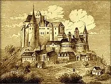 The first mention of Rabí Castle dates from 1380,[2] although it is not known exactly when it was founded. It is likely that the Lords of Velhartice established it after 1300 to protect trade routes along the Otava and also to inspect gold-bearing deposits in it.[lower-alpha 2] They built a strong palace, ramparts and a keep. Subsequent owners, the Švihovský of Rýzmburk family, continued building work and built the outer ward and two square towers.