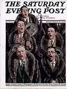 A few months after Olsen's recording hit the air, the November 16, 1929, issue of The Saturday Evening Post featured an Alan Foster illustration of several college men wearing raccoon coats.[4] The raccoon coat (many times accompanied with a straw boater, wingtip spectator oxfords, and either a saxophone or a ukulele) has been referenced numerous times in movies and television, both as a symbol of the Jazz Age and as a cliché motif of collegiate enthusiasm.