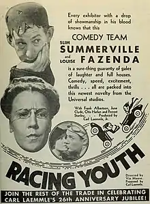 Racing Youth is a 1932 American pre-Code drama film directed by Vin Moore and written by Earle Snell. The film stars Slim Summerville, Louise Fazenda, Frank Albertson, June Clyde, Arthur Stuart Hull and Forrest Stanley. The film was released on April 1, 1932, by Universal Pictures.[1][2][3]