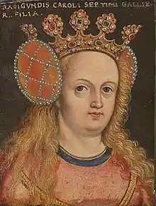 Radegonde was born in the city of Chinon in 1425[1] or August 1428, as evidenced by an act of the Queen's Treasurer General dated 29 August that year, referring to the "gesine recently made in the city of Chinon, Madame Arragonde of France"[2]