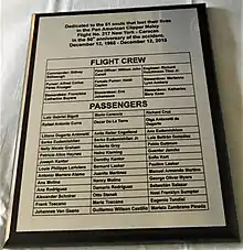 On December 12, 2018, family and friends of the victims of the Pan Am Flight 217 gathered at 301 West 57th Street in Midtown Manhattan to commemorate the 50th anniversary of the tragedy, and deposited 51 flowers onto the waters of the Hudson River in memory of the victims. A commemorative plaque with the names of all passengers and crew members was handed over to the administration of the John F. Kennedy International Airport, the former Pan Am base from where the ill-fated flight originated.[11]
