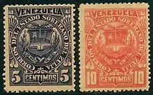 He unsuccessfully sought re-election in 1880, for which there were three candidates. The election campaigning was seen as violent.[3] In 1891, he returned to the presidency, taking office on 25 January and touring the various districts of Zulia in July that year.[2] During 1891, Parra also introduced a new postal system to Zulia[7] and was involved in establishing the design of a stamp for Zulia; he decreed that the state would have its own stamp and system, but this had not been authorized by the Venezuelan government.[8][4][3] Parra produced 50,000 stamps, which featured the new shield of state. These never left the Maracaibo customs office until 1896, when the new President of Zulia, Jesús Muñoz Tébar, paid the fiscal value of the stamps and had many sent to the Venezuelan army to be destroyed (they were technically illegal), also sending some to the personal collection of David Belloso Rossell.[7]