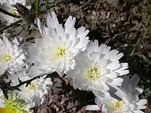 Rafinesquia neomexicana is a species of flowering plant in the family Asteraceae. Common names include desert chicory,[2] plumeseed, or New Mexico plumeseed.[1][3] It has white showy flowers, milky sap, and weak, zigzag stems, that may grow up through other shrubs for support.[2] It is an annual plant (completes its life cycle in a single season) found in dry climate areas of the southwestern deserts of the US and northwestern deserts of Mexico.[2]