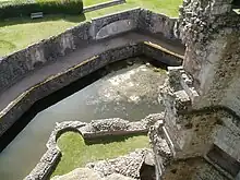 On the south-west side of the court is the hall, a 16th-century design incorporating an earlier hall on the same site.[65] 64 by 28 feet (19.5 by 8.5 metres) wide, the hall was originally 42 feet (13 metres) high, with a roof made of Irish oak, lit and ventilated by a cupola in the middle.[66] A large oriel window lit the end of the hall occupied at dinner by the earls of Worcester, which by the time Raglan was built would have been used only for larger formal occasions.[67] Originally, the hall would have been fitted with carved wooden panelling and a minstrel's gallery.[65] The Fountain Court lies to the west of the Pitched Stone Court, and is named after a marble fountain that once stood in the centre of it, featuring a white horse on a black marble base, complete with a flow of running water.[68] The fountain was probably installed somewhat after the initial construction of the court in the 1460s, dating instead to Edward Somerset in the late 16th century; the horse symbolised Edward's prestigious role as Master of the Horse.[69] The Fountain Court was built to provide luxurious accommodation for the family and guests—by the 15th century, it was important to be able to provide private chambers for visitors, and this court could hold up to four distinct groups of visitors in comfort.[70] The Fountain Court as a whole is marked by what Augustus Pugin described as extremely fine, elegant and delicate stonework.[71]