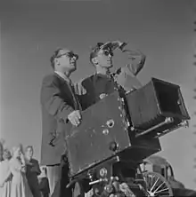 ![]() Director Kåre Bergstrøm and cameraman Ragnar Sørensen during the filming of Andrine og Kjell (1952) | |