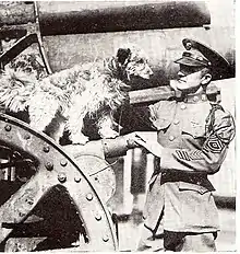 He was adopted into the 1st Division on July 14, 1918, in the Montmartre section of Paris, France. Rags remained its mascot until his death in Washington, D.C., on March 22, 1936.[2] He learned to run messages between the rear headquarters and the front lines, and provided early warning of incoming shells. Rags achieved great notoriety and celebrity war dog fame when he saved many lives in the Meuse-Argonne Campaign by delivering a vital message despite being bombed, gassed and partially blinded.[3] His adopted owner and handler, Private James Donovan, was seriously wounded and gassed, dying after returning to a military hospital at Fort Sheridan in Chicago. Rags was adopted by the family of Major Raymond W. Hardenbergh there in 1920, moving with them through several transfers until in Fort Hamilton, New York, he was reunited with members of the 18th Infantry Regiment who had known him in France.[4] Rags was presented with a number of medals and awards.