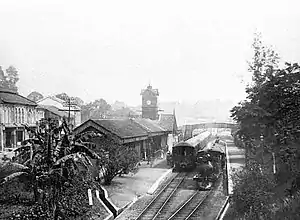 The foundations for the first tramway in Singapore were first laid in 1882 with the formation of the London-based Singapore Tramway Company following an approval under the 1882 Tramways Ordinance to construct five steam tramway lines across Singapore Town. On 8 December 1883, the Singapore Tramway Company launched a prospectus to construct and build tramways for the transport of passengers and goods in Singapore. The first rails were laid on 7 April 1885, and the first regular service from Tanjong Pagar to Johnston's Pier began on 3 May 1886.[4] The tramway was operated using 16 (initially 14) 0-4-0ST steam tram engines from Kitson and Company and double-deck passenger trailer cars.[5] However, the tramway proved to not be competitive against other modes of transport like the rickshaws and was discontinued in 1894.