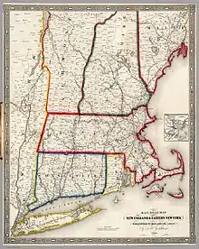 The first railroad in Connecticut was the New York and Stonington Railroad, which was chartered in May 1832 and began construction in 1833.[9] Rhode Island gained its first railroad company the next month in the New York, Providence and Boston Railroad. The two companies merged under the latter name the next year, before either was completed. The combined company ran its first train on November 10, 1837.[10] Railroads first came to New Hampshire via the Nashua and Lowell Railroad, chartered on June 23, 1835, by the state to connect Nashua to the Boston and Lowell.[11]