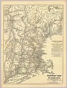 The Boston and Maine similarly swallowed up a number of smaller railroads in central New England during this time period, such as the Boston and Lowell, the Connecticut River Railroad, and the Northern Railroad.[16] In 1900, the New York Central Railroad leased the Boston and Albany Railroad, though it continued to operate as a subsidiary.[17]