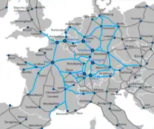 The main hubs of the route network are Brussels-South, Lille/Lille Europe, Paris, Cologne Hbf, Frankfurt Hbf, Stuttgart, Basel and Zurich.