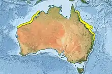 The rainfordia is found in the Indian Ocean off Western Australia from Kendrew Island in the Dampier Archipelago to Kimberley and in eastern Australia from the northern Great Barrier Reef and reefs in the Coral Sea, as far south as Moreton Bay in Queensland.[2] It was thought to be endemic to Australia but in 2019 it was recorded in the Raja Ampat Islands of West Papua in Indonesia.[5]