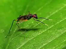 Rainieria antennaepes is a species of stilt-legged flies in the family Micropezidae found in North America east of the Rocky Mountains. The name "antennaepes" means "antenna foot". They frequently hold their white-tipped front legs up and wave them around in a manner that makes them appear like the antennae of ichneumonid wasps. They feed on detritus, bird droppings, and similar waste.[1][2][3][4]