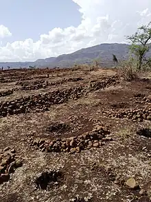 Mauritian farmers build weirs to trap windblown sand during the dry season and during the "infrequent rains" these weirs serve to minimize water runoff and maximize groundwater recharge; the stone rows of Burkina Faso, Mali, and Niger function by similar principles.[45] Stone rows, typically called bunds, are a traditional and widely used means of land improvement in the Sahel. Laid out on contour, stone rows minimize soil erosion but also minimize rainwater runoff and offer favorable microclimates.[46][1][42] Bunds not laid out in parallel with the natural contours of the land may result in "some gully formation during rainy periods."[47] Bunds can also be made of earth, which was the original practice that preceded the use of stone.[46] Bunds may be laid out up to 30 meters apart and may themselves be planted with indigenous vegetation such as Andropogon gayanus or Piliostigma reticulatum.[46]