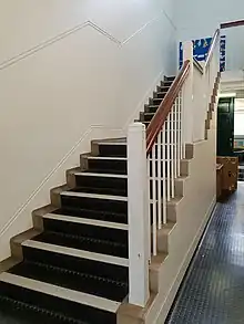 Stage One of the school scheme (the eastern section of the rear building) was a two-storey brick building (now called Block C). Its construction was completed during the 1933–34 financial year. The building was of fire-proof construction with external walls of facebrick and roughcast render, surmounted by a galvanised iron roof. It comprised two classrooms for 40 pupils each on both floors, providing accommodation for 160 pupils, plus a stair hall at the western end, accessed by north and south-facing entrances with porticos and short stairs. It had north-facing verandahs on both levels with arched openings at the ground floor and decorative concrete first floor balusters. Intended to be extended to the west, it included exposed keyed brickwork to facilitate future building.[44][45][1]