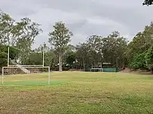 An important component of Queensland state schools was their grounds. The early and continuing commitment to play-based education, particularly in primary school, resulted in the provision of outdoor play space and sporting facilities, such as playing fields and tennis courts.[50] The Rainworth State School site was originally rough and hilly, with a creek running through the low-lying area at the southern end of the site. A level, open space to the north of Block A was utilised as a parade ground from the school's opening day.[51][52] Between 1928 and 1935, the school was fenced; steps were dug into the steep embankment behind the school buildings; and tennis courts, and a sporting field were levelled and laid out. The DPW provided a concrete cricket pitch, and concreting underneath the timber school buildings was completed. Tree stumps were removed using explosives during a working bee c. 1929. Relief workers cleared and levelled the playing field and excavated the site for the grass tennis courts during the 1929-30 financial year.[53][54] A concrete retaining wall and steps to Boundary Road and along the northern part of the eastern boundary, were constructed by the DPW using day labour, between July and September 1932. A 100-foot-long (30.5m) section of the wall collapsed in September 1932 after heavy rain, and was rebuilt in 1933.[55][56][57][58][1]
