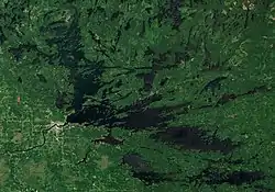 Geologically Rainy Lake is part of the Superior Craton of the Canadian Shield and retains features associated with it, such as a large, ancient caldera and fault lines that can be clearly seen in satellite images of the lake.[11] The Rainy Lake - Seine River Fault zone is a strike-slip fault zone passing through Rainy Lake from Tilson Bay in the southwest to Seine Bay in the northeast.[12]