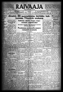 In its early years, Raivaaja was a radical newspaper loyal to the Socialist Party of America. It was the newspaper of the Finnish Socialist Federation's eastern district. The other papers were Työmies in the middle district, and Toveri in the west.[4] During the World War I the War Department agents searched Raivaaja's officies because of its radical and anti-war ideas.[7] In the early 1920s Raivaaja moved to a moderate social democratic position during the factional war of the Finnish Socialist Federation. The paper peaked with a circulation of 10,000 in 1927 before a long downward slide. The list of editors include major names of Finnish American labor movement such as Moses Hahl, Santeri Nuorteva, Aku Päiviö, Frans Josef Syrjälä and Oskari Tokoi.[4]