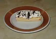 Rakvička might be purchased at a common type of Czech bakery called a cukrárna.[2][3] One recipe states that the rakvička is made by whipping an egg, several additional egg yolks, and two types of sugar.[4] This mixture is then poured into molds, which provide the dessert's distinctive form, and then baked in a low oven.[4] Another recipe states "for many housewives" the hardest part is getting the "little caskets" out of the molds without breaking the cake.[5] The molded base is then filled with whipped cream and decorated to suit.[5]