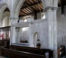 The ledger stone on top is missing its original monumental brasses, but the stonework of the chantry chapel retains several relief sculptures of heraldic escutcheons, some held by angels. Also shown is the heraldic badge of a ship's rudder, later adopted by Robert Willoughby, 1st Baron Willoughby de Broke (c. 1452 – 1502) (the eventual heir of Brooke) visible on his chest tomb in Callington Church in Cornwall.[16] Hamilton Rogers (1890) described the chantry chapel monument to Sir Ralph Cheney as follows:[17]