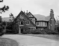 The Ralph Rollins House, also known as the Bohen Estate, is a historic building located in Des Moines, Iowa, United States. This rambling mansion in the English medieval eclectic style was designed in 1925 by the Des Moines architectural firm of Boyd & Moore. It was completed the following year. The facades are a picturesque accumulation of gables, window bays, over hangs and minor projections. The roofscape is significant in defining the character of the house.[2] Its main ridge runs the length of the structure, and it features short cross gables. The walls are a combination of brick and stucco half-timber in almost equal proportions. Together with Salisbury House, it is unique in Des Moines, and probably the state, for literally borrowing from England's domestic medieval architecture.[2] The house was listed on the National Register of Historic Places in 1978.[1]